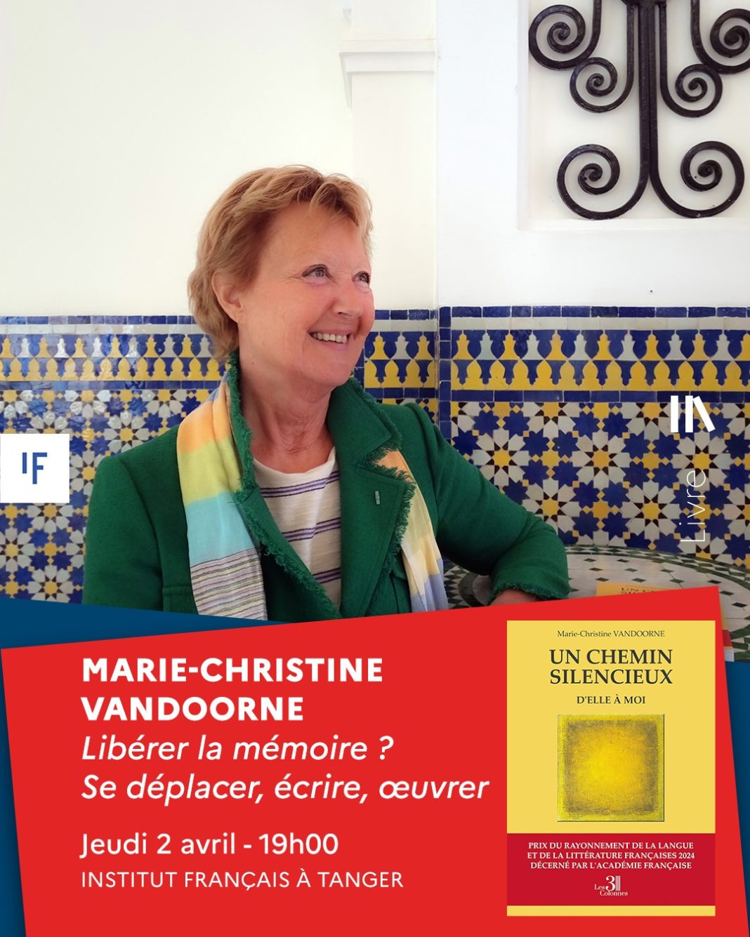 Institut français à Tanger organise, le 02 avril 2026 à 19h au Grand Salon, 2, Place de France une rencontre avec FMarie-Christine Vandoorne.
