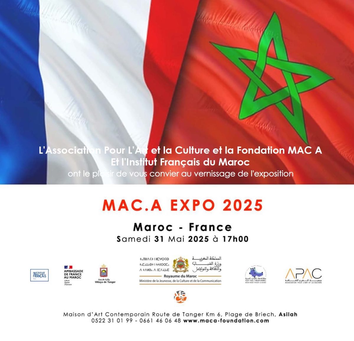 L’Association Pour l’Art et la Culture et la Fondation MAC.A, en partenariat avec le Ministère de la Culture et l’Institut français du Maroc, ont le plaisir d’annoncer la tenue du Symposium International d’Art Contemporain France-Maroc, du 24 mai au 1er juin 2025.