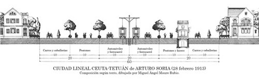 Le projet de ville linéaire Ceuta-Tétouan est paru dans la brochure de propagande présentée au premier congrès international de l’art de construire villes et organisation de la vie municipale de Gand en 1913, l’idée apparaît déjà, anticipant d’autres lieux proposés : la Chine, l’Argentine, la Sibérie, les Philippines, Ceylan et le Canada. Arturo Soria y Mata, comme son contemporain et grand africaniste Joaquín Costa, considérait le Maroc comme le prolongement naturel de l’Espagne, et donc l’espoir des classes les plus pauvres, les délinquants, chômeurs, paysans sans terre et militaires à émigrer et s’installer sur ledit territoire. Le projet de la ville linéaire comme ville coloniale au Maroc, constituera la solution et le remède à tous les maux de notre économie: «On pourrait ainsi avoir, grâce à ce syndicat de capitalistes étrangers, une grande cité linéaire qui servirait à l’extension de Tanger, ville ou tout serait à faire. La cité linéaire autour de Tanger partirait de la mer et après avoir contourné la vieille ville par une courbe capricieuse , viendrait se terminer sur un autre point du littoral , répandant sur son passage les bienfaits de la civilisation et augmentant encore le charme de cette métropole marocaine déjà si pittoresque et si admirablement située, Tanger , si l’ Europe le veut , est appelée à être , avec le temps , une ville de quelques centaines de mille d’ âmes, attirant elle un grand nombre de touristes».(Dixit de Arturo Soria)