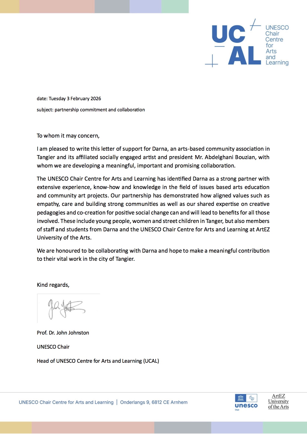 Dans cette lettre signée par le Prof. Dr. John Johnston, la Chaire UNESCO identifie DARNA comme un partenaire solide, reconnu pour son expertise en pédagogie artistique, en co-création et en engagement communautaire. Cette collaboration met en avant des valeurs communes telles que l’empathie, le renforcement des communautés et l’éducation artistique comme levier de transformation sociale.